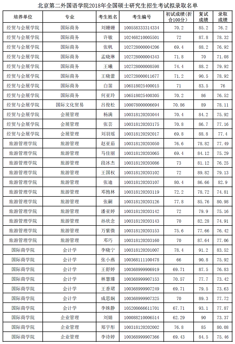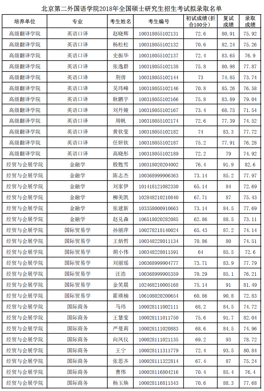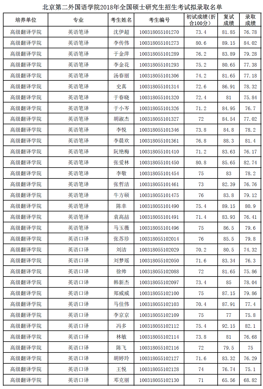 北京第二外国语学院考研辅导班:北京第二外国语学院2018年全国硕士研究生招生考试拟录取名单