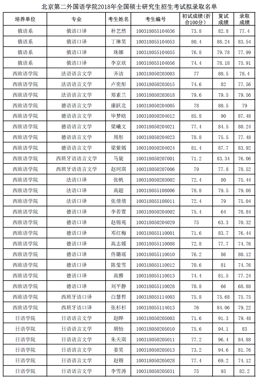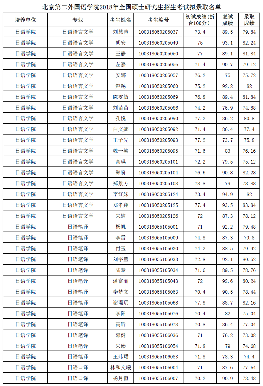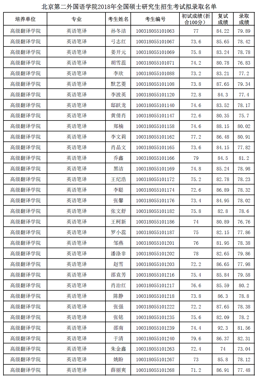 北京第二外国语学院考研辅导班:北京第二外国语学院2018年全国硕士研究生招生考试拟录取名单