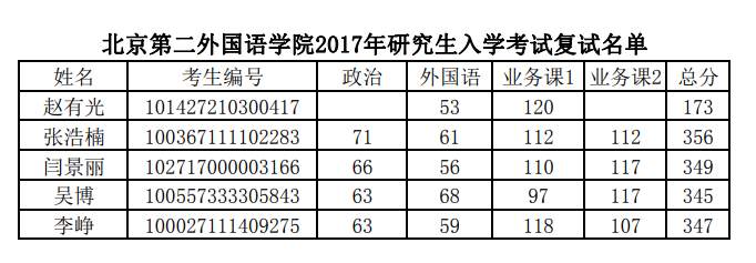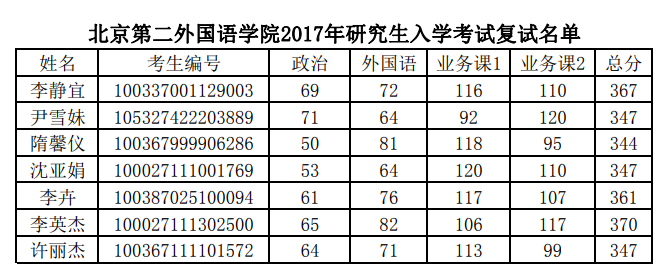 北京第二外国语学院考研辅导班:北京第二外国语学院2017年研究生入学考试复试名单