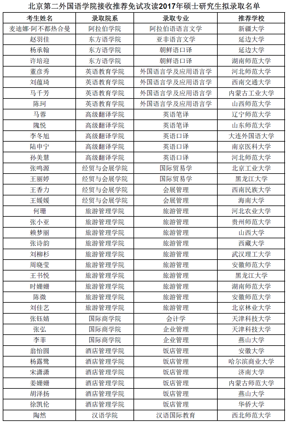 北京第二外国语学院考研辅导班:北京第二外国语学院接收推荐免试攻读2017年硕士研究生拟录取名单