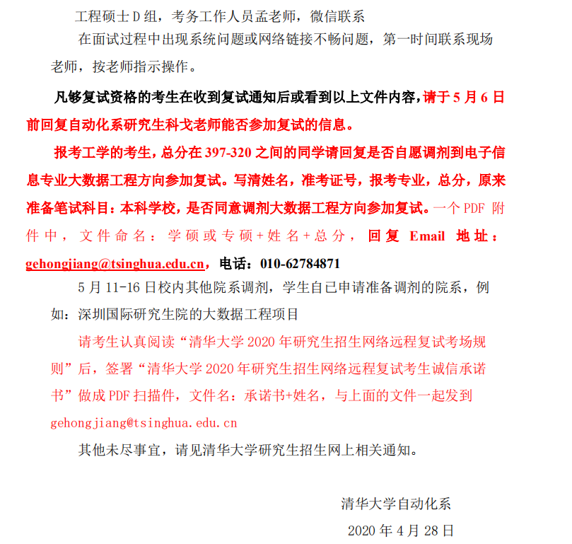 清华大学考研辅导班:清华大学自动化系2020年考研复试名单及录取实施细则
