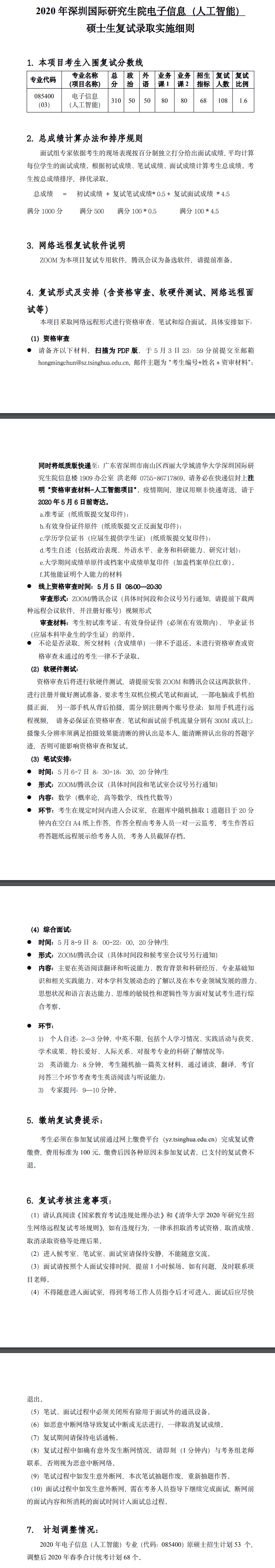 清华大学考研辅导班:2020年清华大学深圳国际研究生院电子信息(人工智能)硕士生考研复试招生名额及安排细则