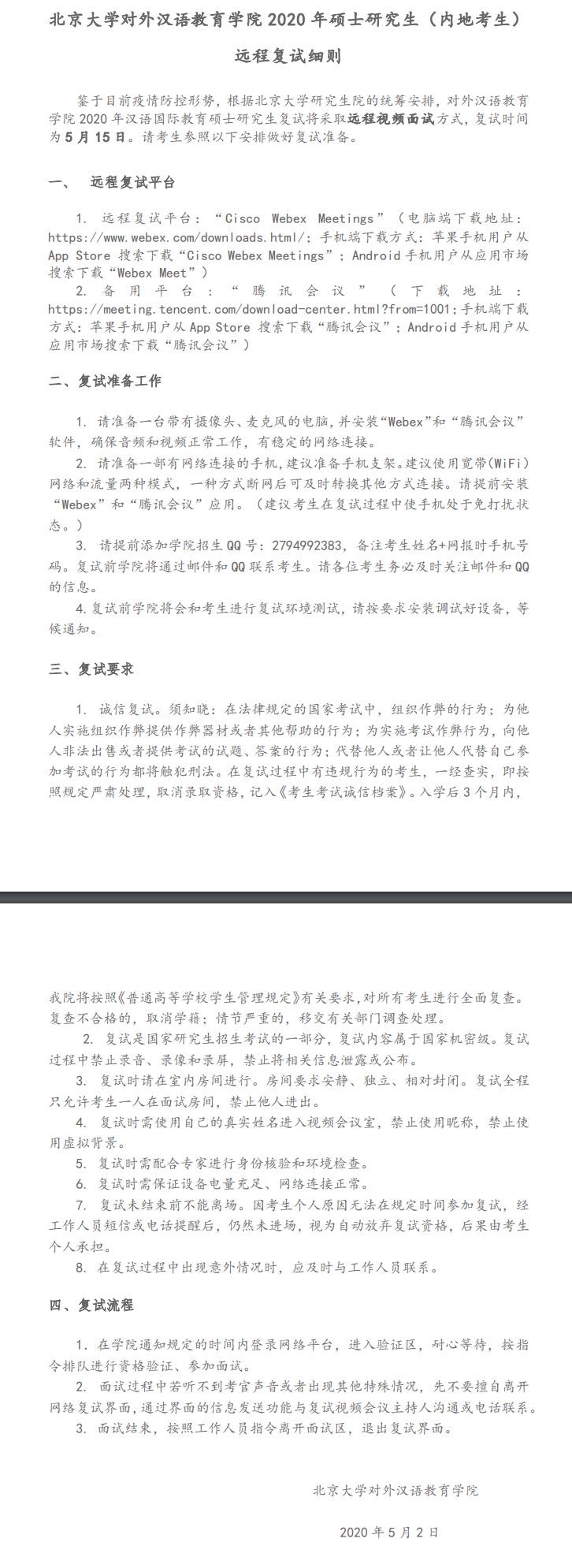 北大考研辅导班:2020年北京大学对外汉语教育学院​硕士研究生远程复试细则