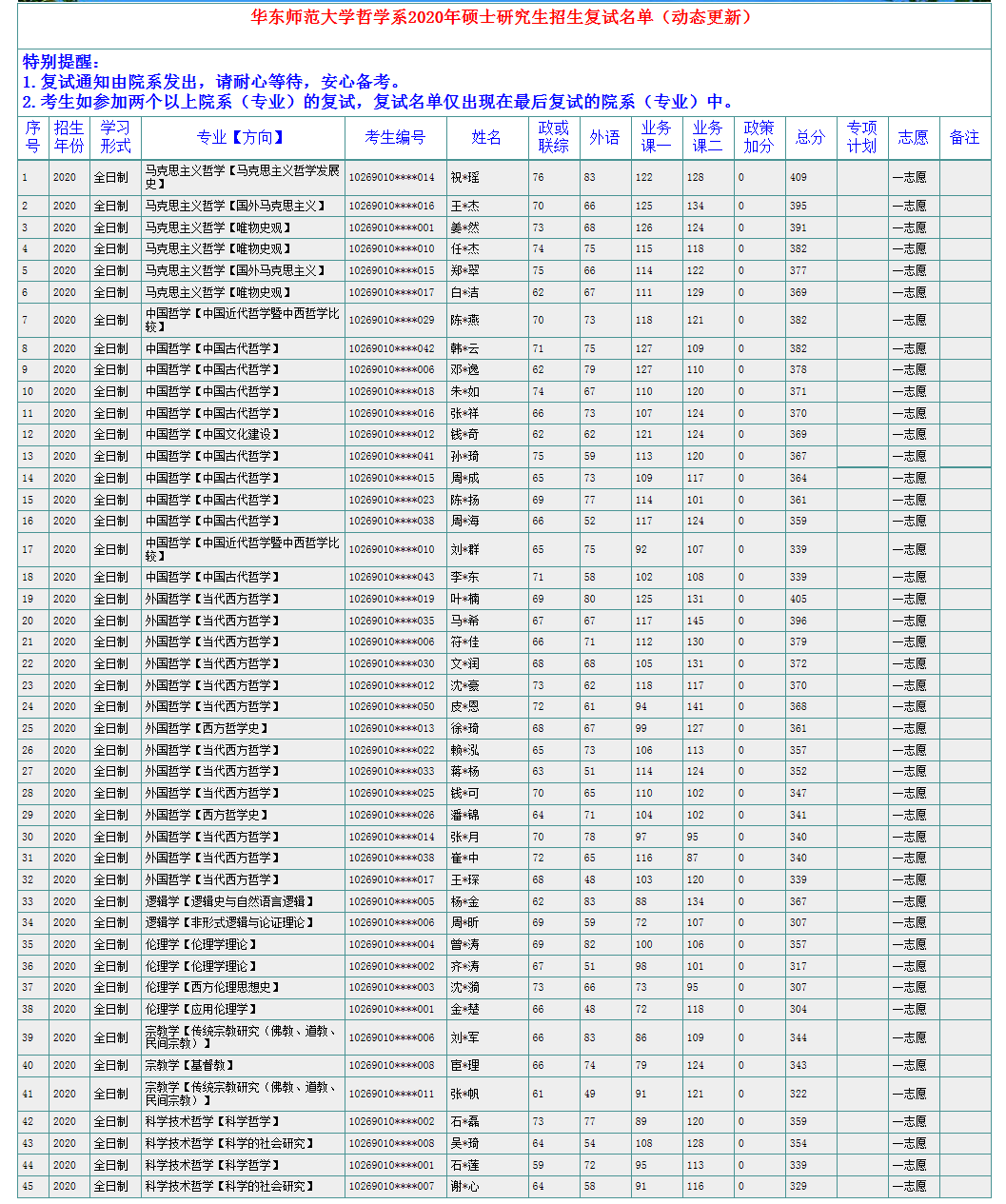 华东师范考研辅导班:2020年华东师范大学哲学系研究生考研复试名单