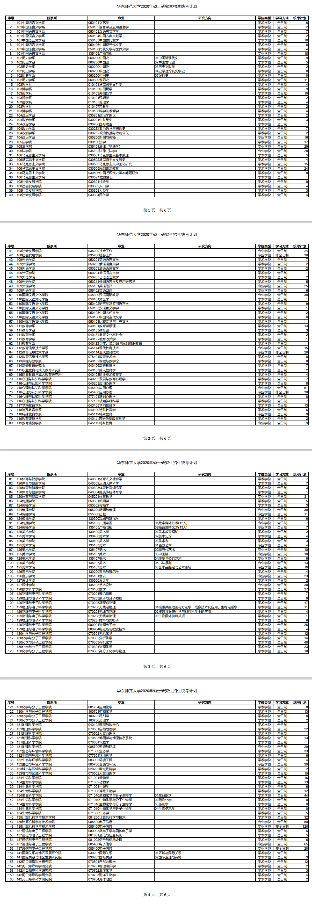 现将华东师范大学2020年硕士研究生招生计划公布,本表数据不含已录取的推免生,不含“少数民族高层次骨干人才”计划和“退役大学生士兵”计划,不含上海市“教硕-规培”计划,但是含未完成招生计划的部分专项计划(如“中法联合培养”专项计划、“上海纽约大学兼职导师招生”专项计划等)。