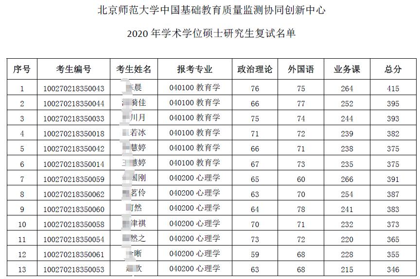 北师大考研辅导班:2020年北京师范大学协同创新中心硕士招生考研一志愿复试名单