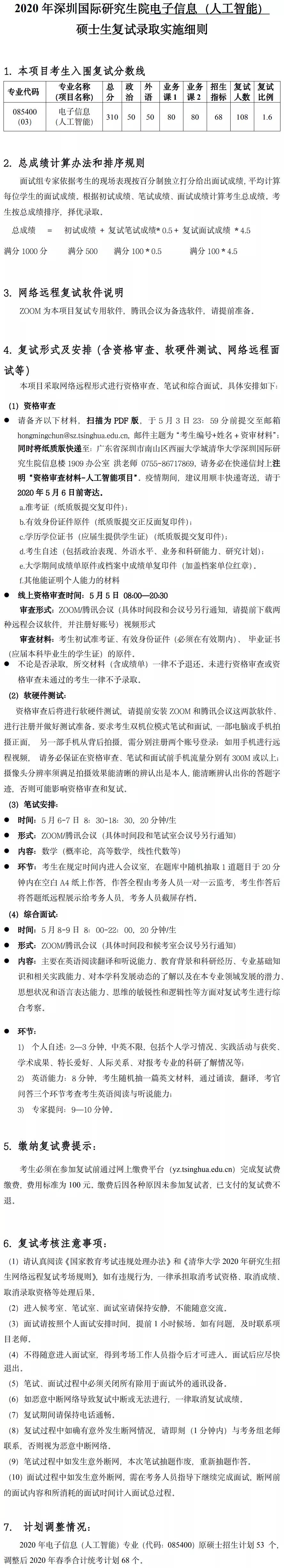 清华大学2020年深圳国际研究生院电子信息(人工智能)硕士研究生复试录取实施细则