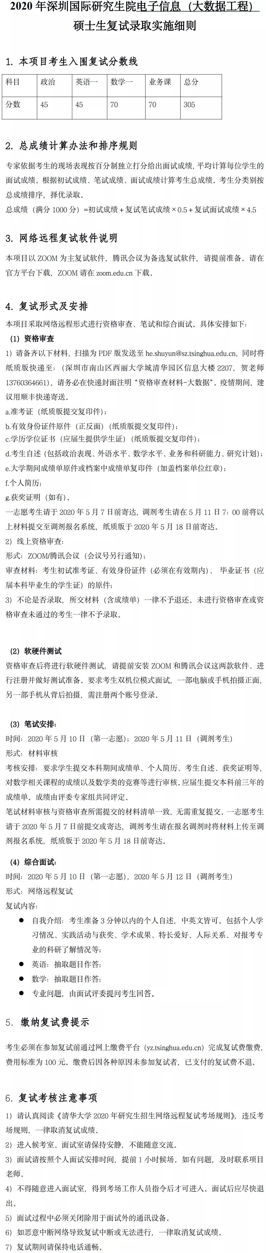 清华大学2020年深圳国际研究生院电子信息(大数据工程)硕士研究生复试录取实施细则