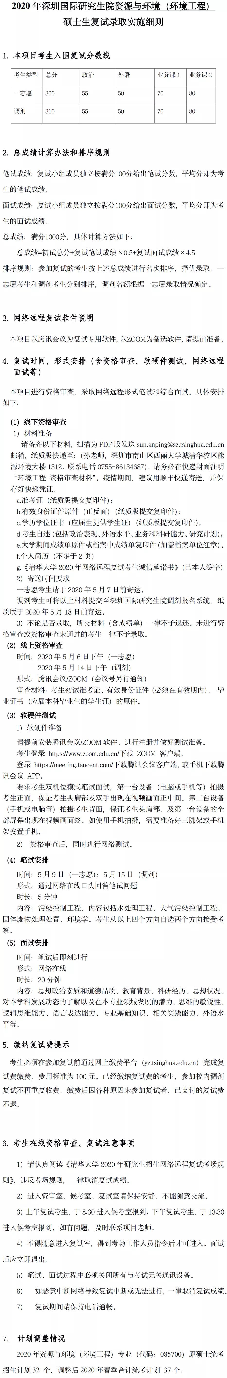 清华大学2020年深圳国际研究生院资源与环境(环境工程)硕士研究生复试录取实施细则