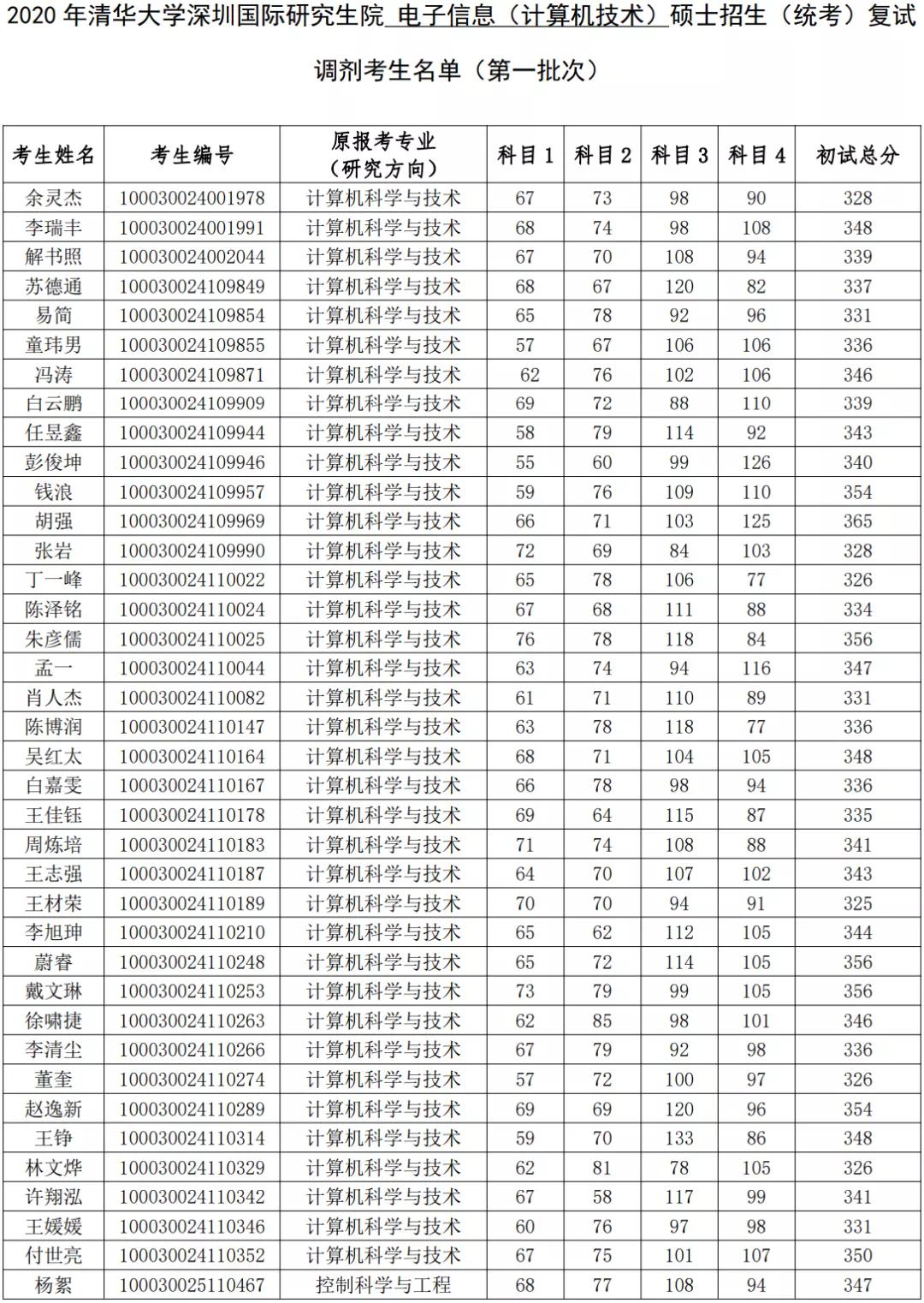 清华大学2020年深圳国际研究生院电子信息(计算机)硕士招生(统考)复试调剂名单(第一批次)