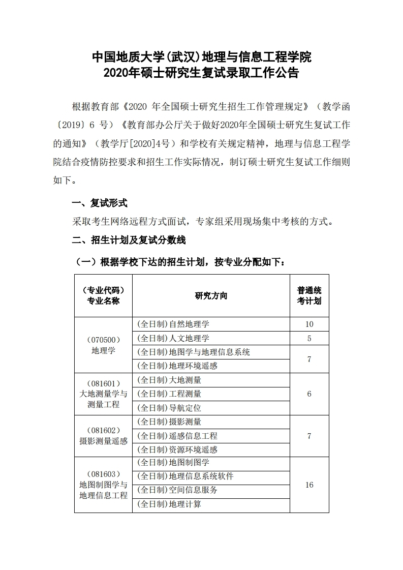 中国地质大学考研辅导班: 中国地质大学(武汉)地理与信息工程学院2020年硕士研究生复试录取工作公告