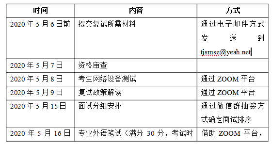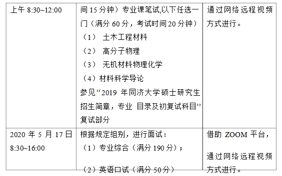 请进入复试的考生严格按照上述时间参加复试,逾期视为自动 放弃! 三、 注意事项: 1. 网络设备测试 进入复试的考生请尽早完成网络视频复试客户端安装,具体安装 说明参见学校研招网公布的《同济大学 2020 年硕士研究生招生考试 复试录取办法》。 我院于 5 月 8 日组织网络设备测试,进入复试的考生均须参加。 我院将以微信形式将会议号和密码告知考生,请保持联系方式畅通。 2.体检: 按照国家文件规定,考生体检工作由招生单位在考生拟录取后组 织进行。体检要求参照教育部、卫生部、中国残联制订的《普通高等 学校招生体检工作指导意见》(教学〔2003〕3 号)和《教育部办公厅 卫生部办公厅关于普通高等学校招生学生入学身体检查取消乙肝项 目检测有关问题的通知》(教学厅〔2010〕2 号)进行。