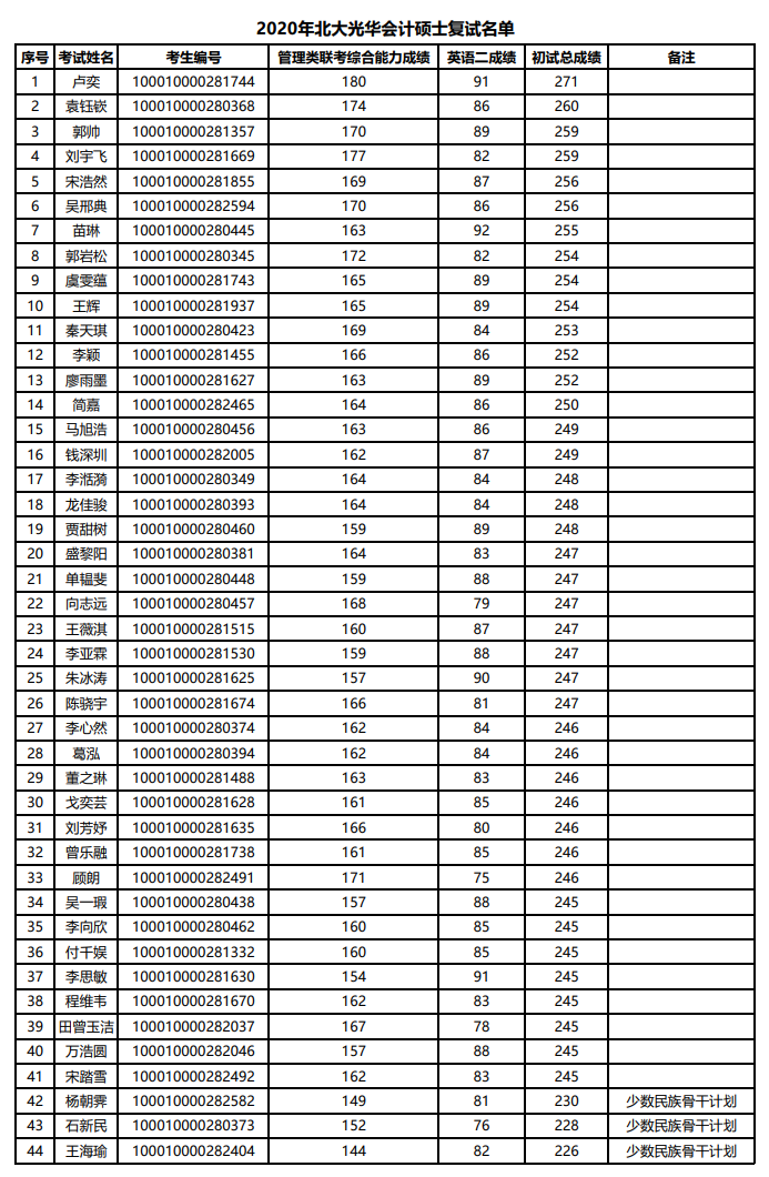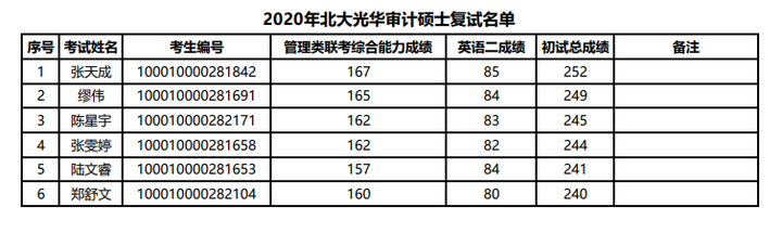根据我院招生计划和考生考试成绩情况,经校研招办批准2020年北京大学会计硕士复试分数线为:管理类综合知识150分,英语60分,总分245分;复试比例为171%;共有41名考生和3名专项计划考生参加复试。审计硕士复试分数线为:管理类综合知识155分,英语55分,总分240分;复试比例为120%;共有6名考生(不含专项计划)参加复试。