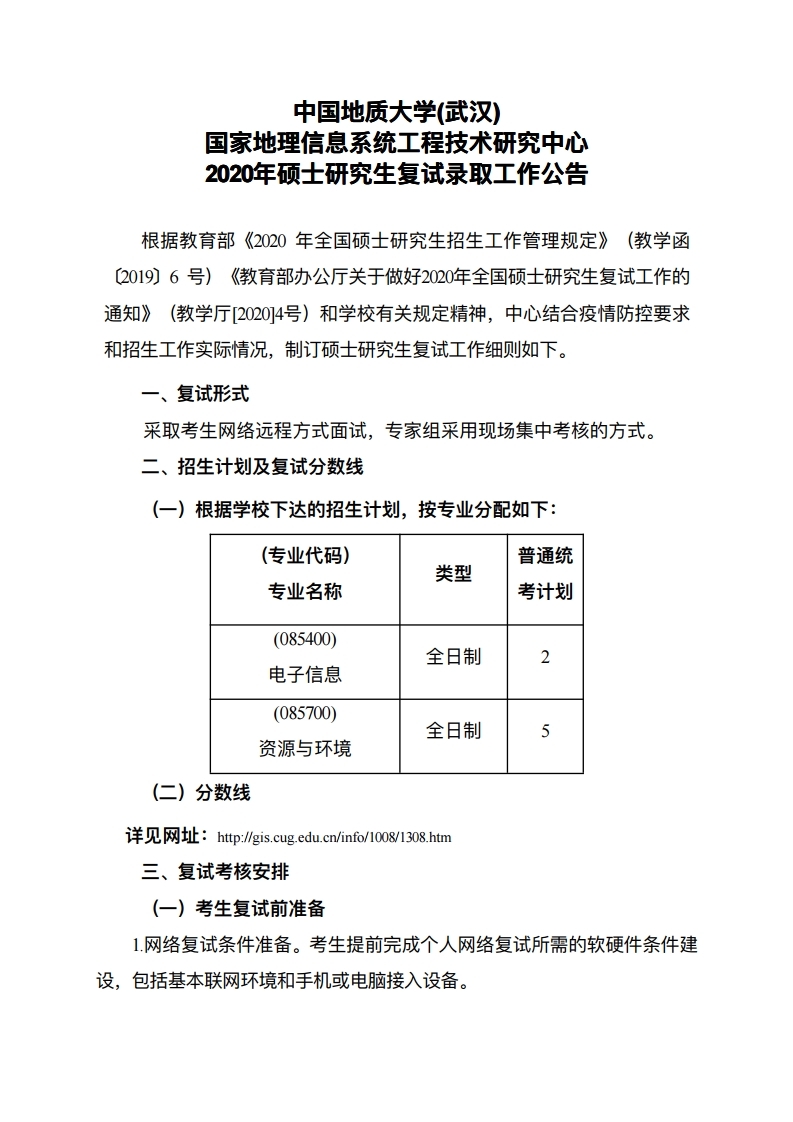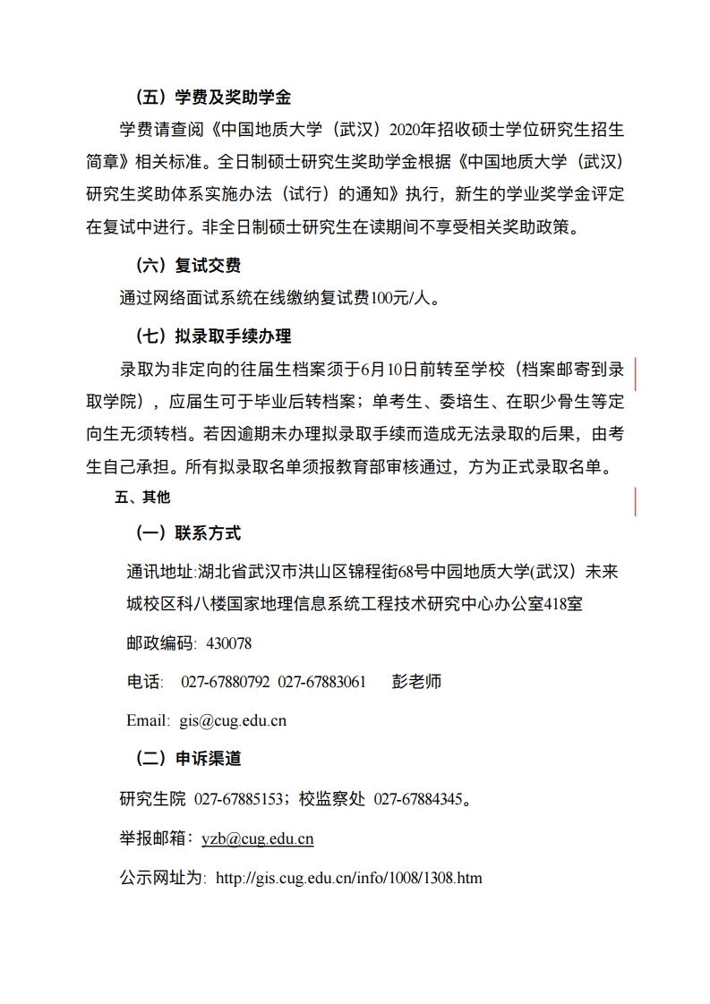 中国地质大学考研辅导班: 中国地质大学(武汉)国家地理信息系统工程技术研究中心2020年硕士研究生复试录取工作公告