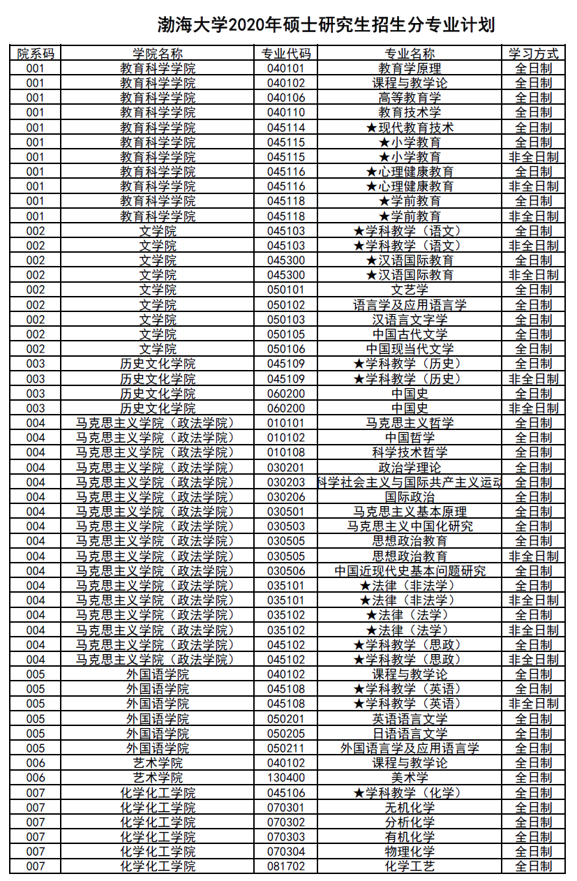 渤海大学考研辅导班:渤海大学2020年硕士研究生招生分专业计划