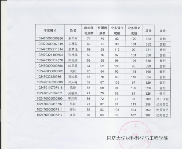 同济考研辅导班: 同济材料科学与工程2020硕士研究生复试名单