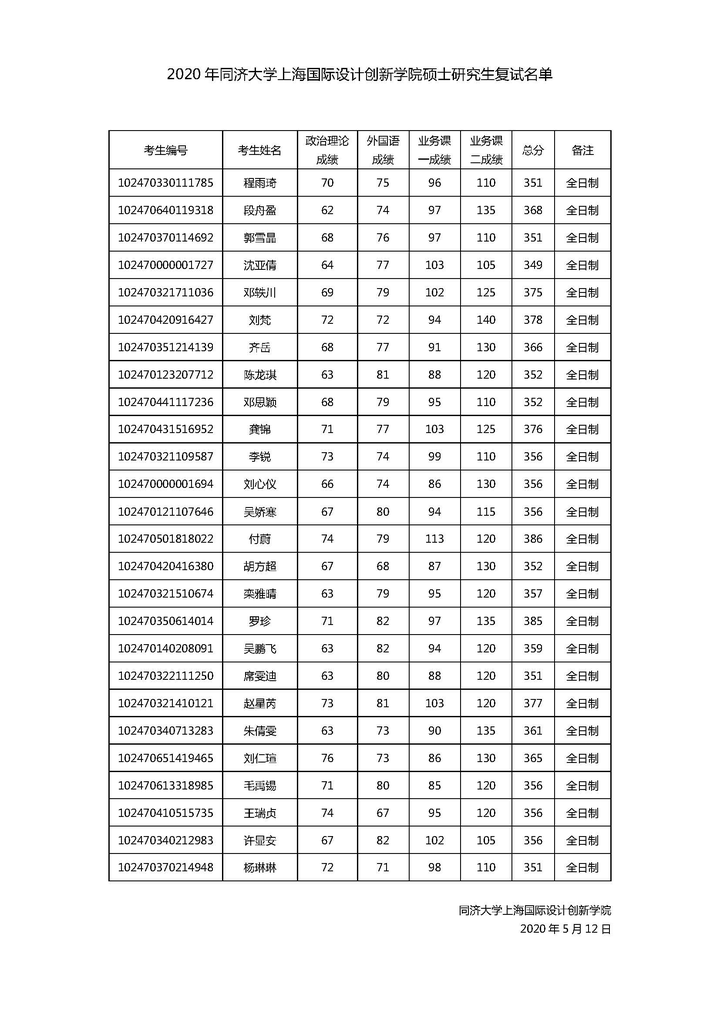 同济考研辅导班:2020同济大学上海国际设计创新学院硕士研究生复试名单