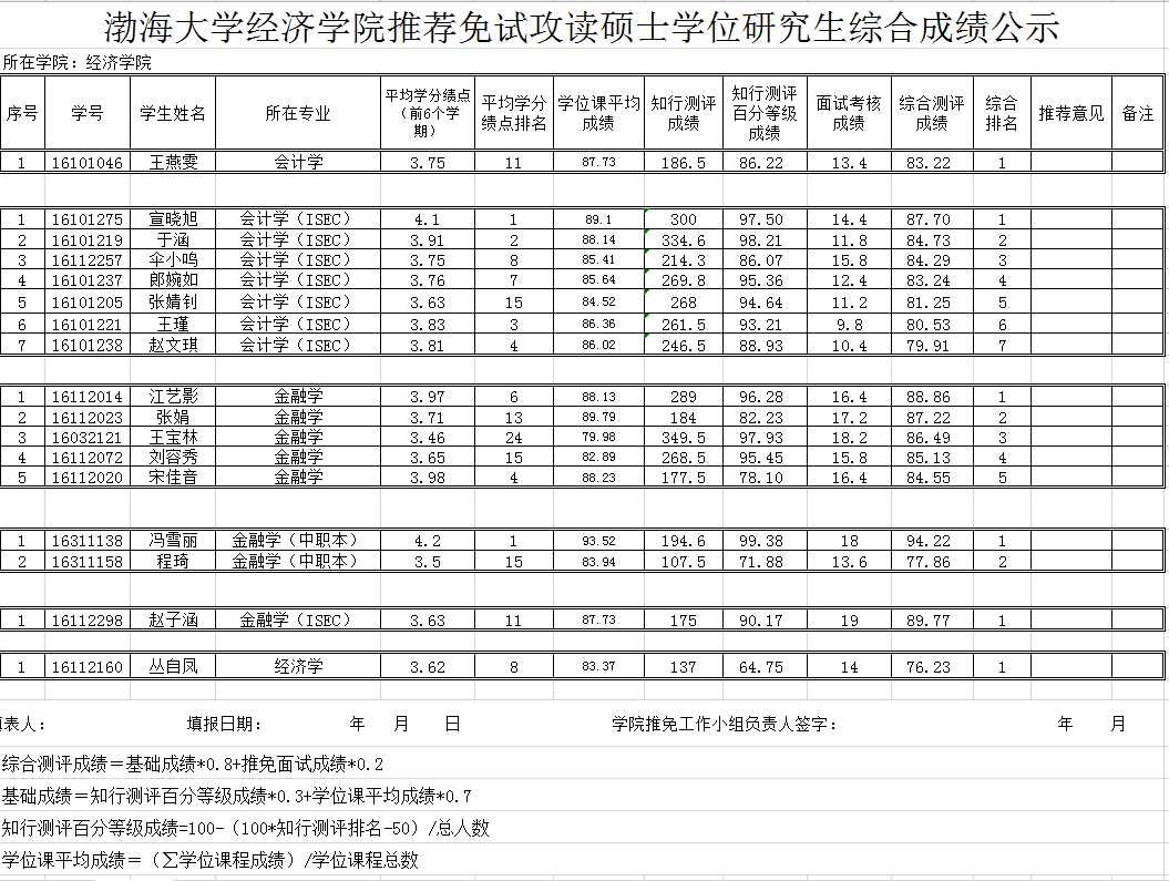 根据渤海大学做好2020年推荐优秀应届本科毕业生免试攻读研究生工作的通知要求,现将我院2020年推免候选人综合测评成绩及其计算方法予以公示。公示期为3天。若有疑议,请以书面形式与学院办公室联系。