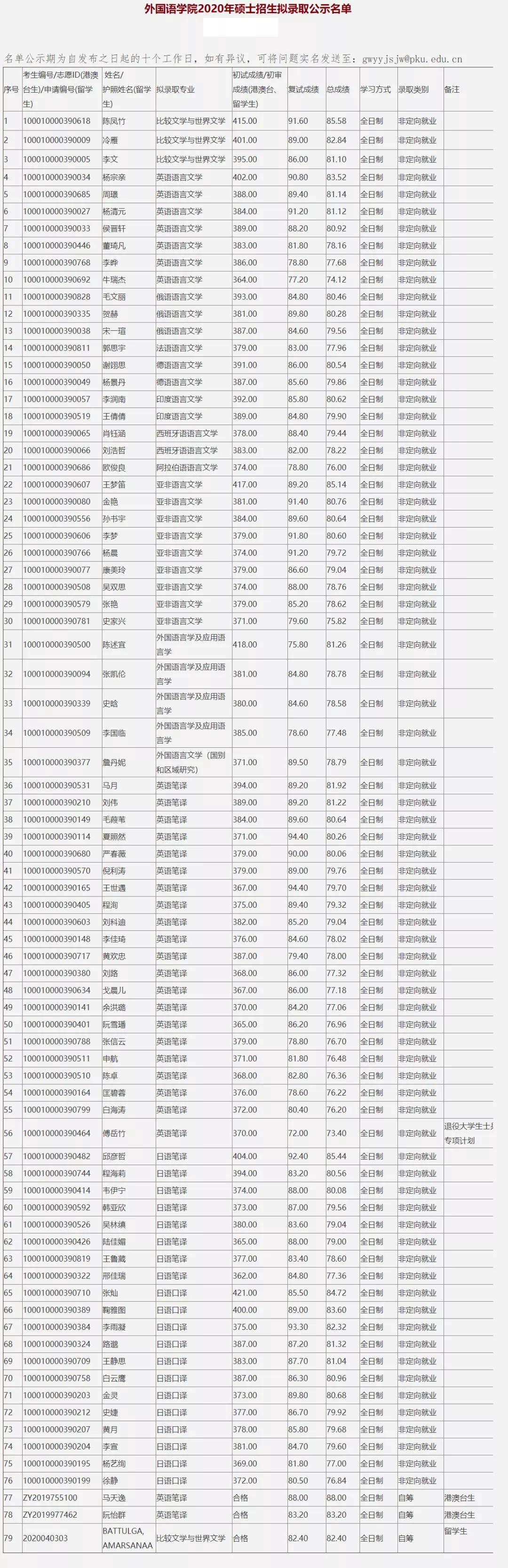 北大考研辅导班:北京大学2020年外国语学院考研拟录取名单