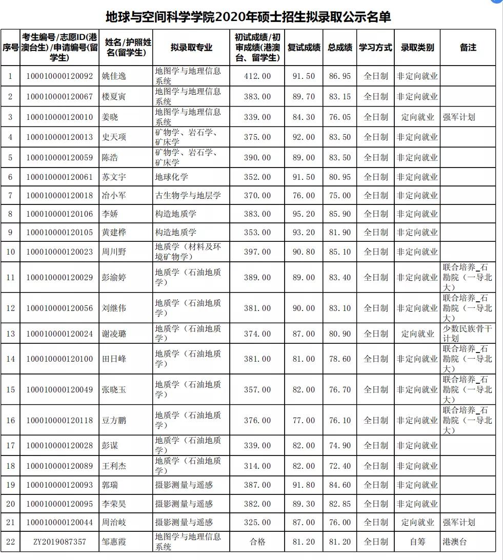 北大考研辅导班:北京大学地球与空间科学学院2020年考研拟录取公示名单