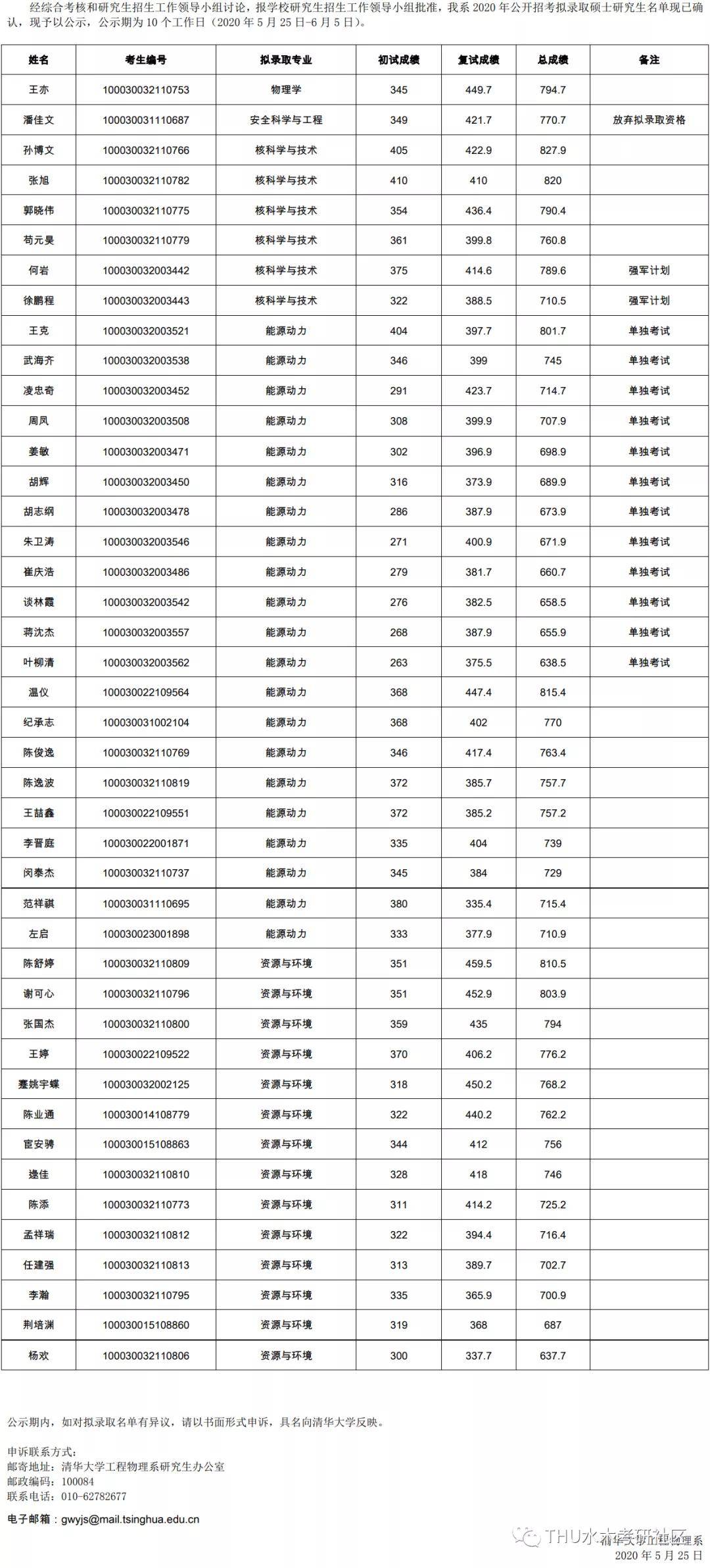 清华大学考研辅导班:2020年清华大学工程物理系硕士研究生拟录取名单