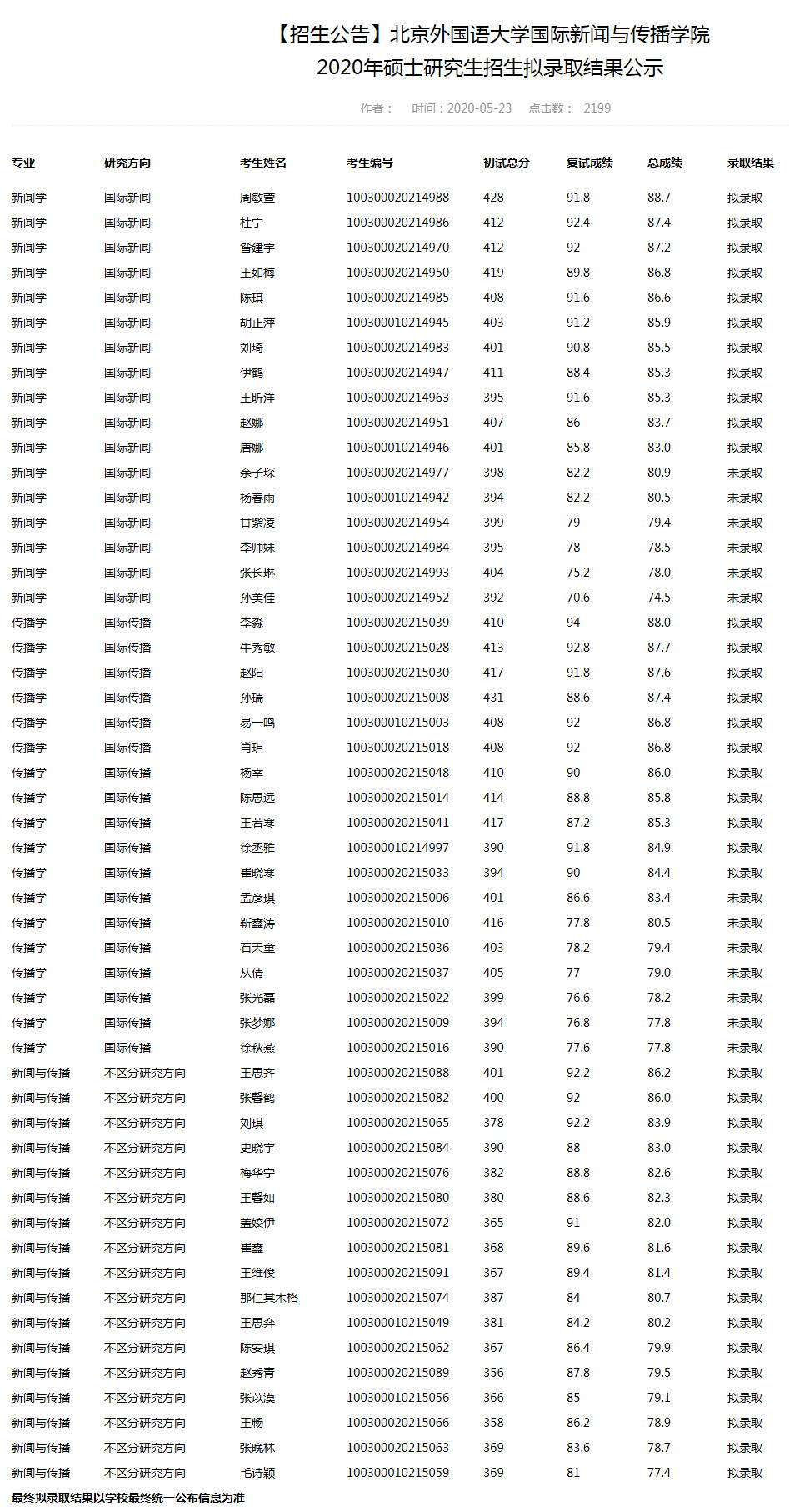北外考研辅导班:北京外国语大学国际新闻与传播学院硕士研究生拟录取名单