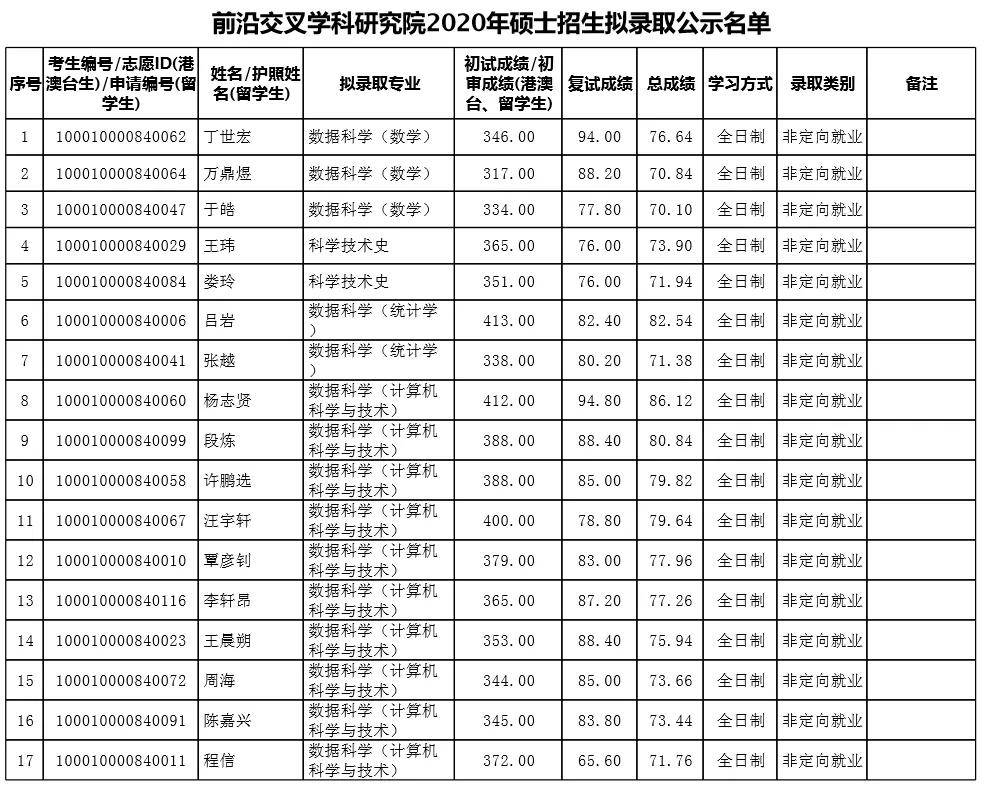 北大考研辅导班:北京大学2020年前沿交叉学科研究院考研拟录取名单公布