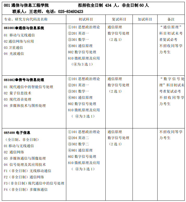 年研究生招生通信与信息工程学院专业目录