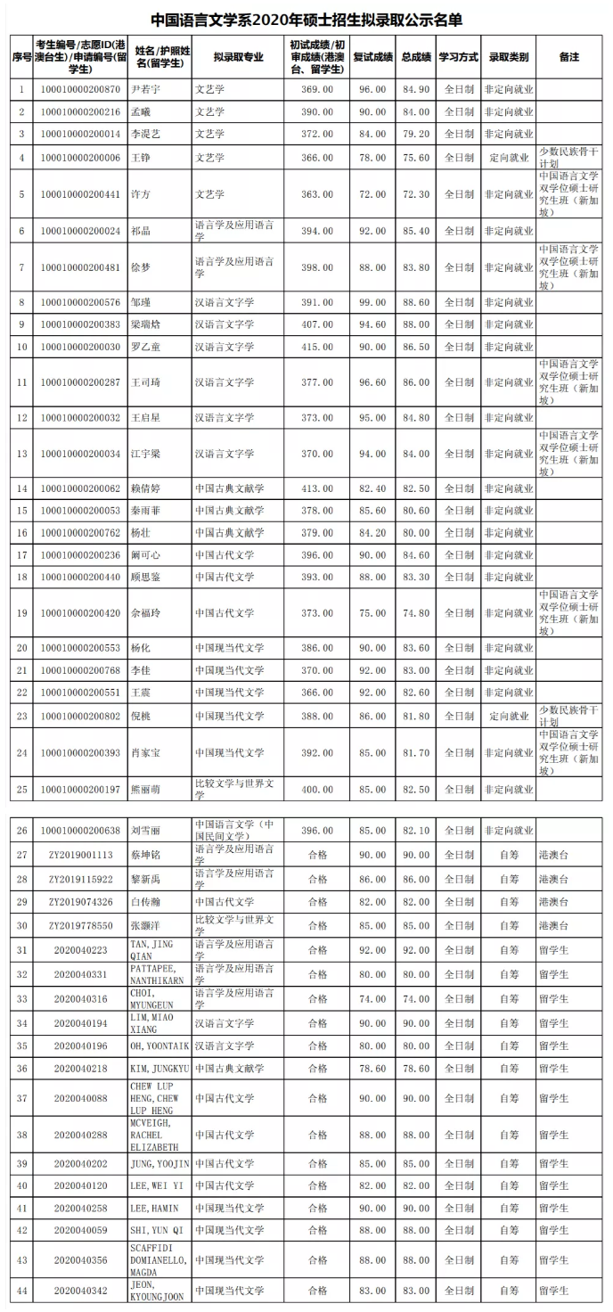 2020年北京大学中国语言文学系考研拟录取名单公布
