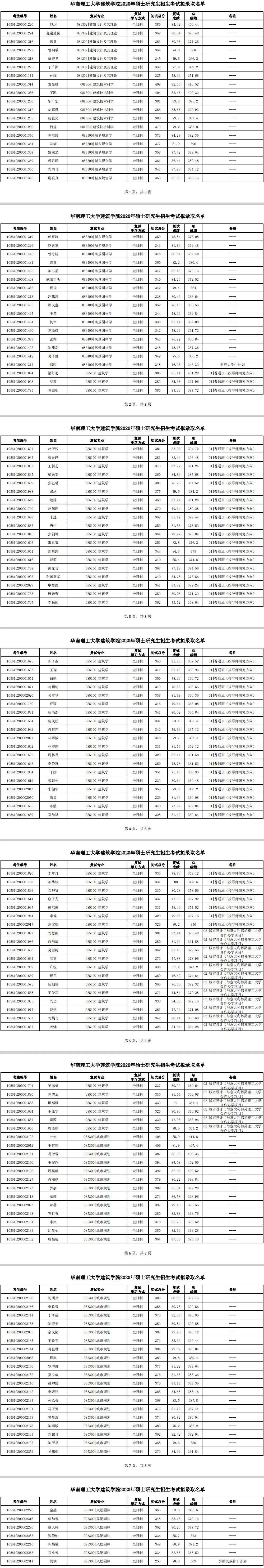 华南理工大学建筑学院2020年硕士研究生招生考试拟录取名单