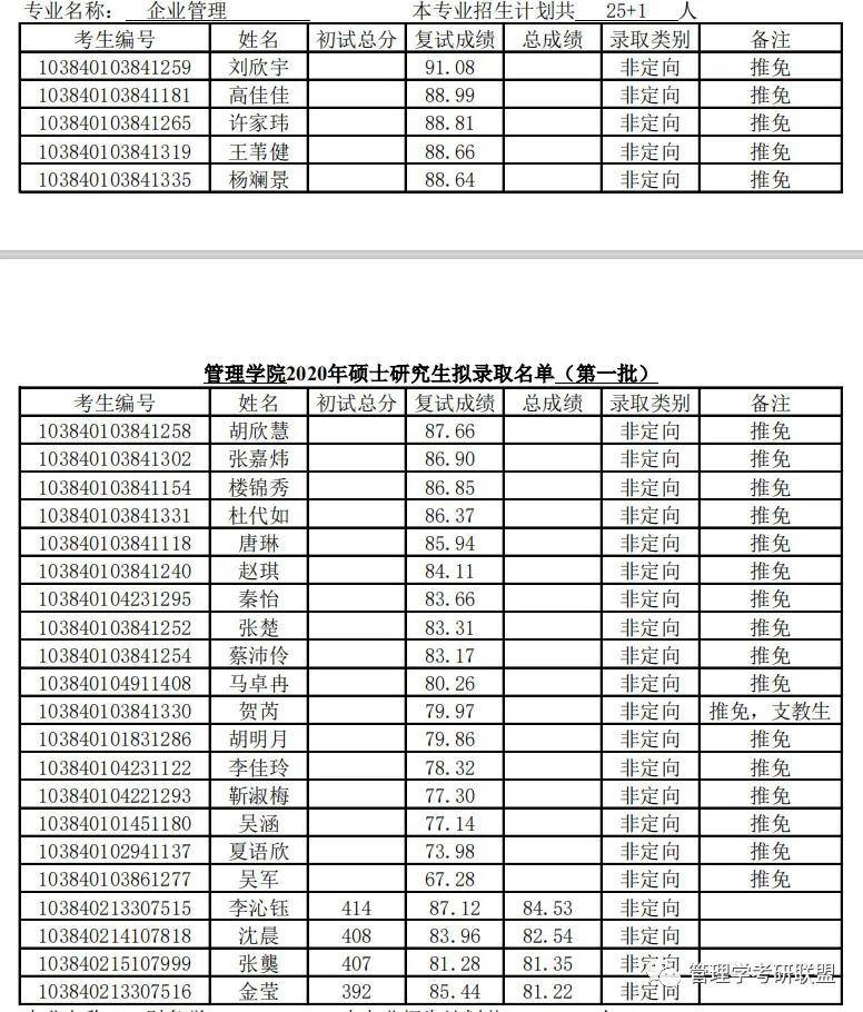 企业管理拟录取26人,其中推免22人,统考录取4人,最低分382,最高分414