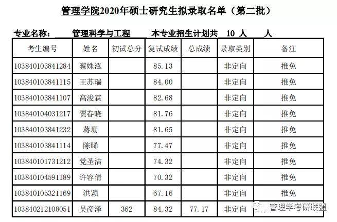 管理科学与工程拟录取10人,其中推免9人,统考录取1人