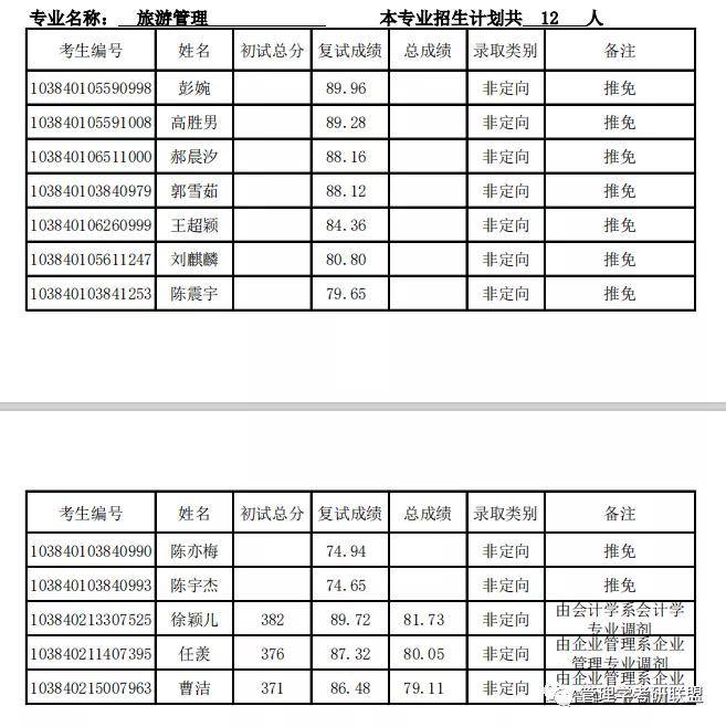 旅游管理拟录取12人,其中推免9人,会计学调剂录取1人,企业管理调剂录取2人