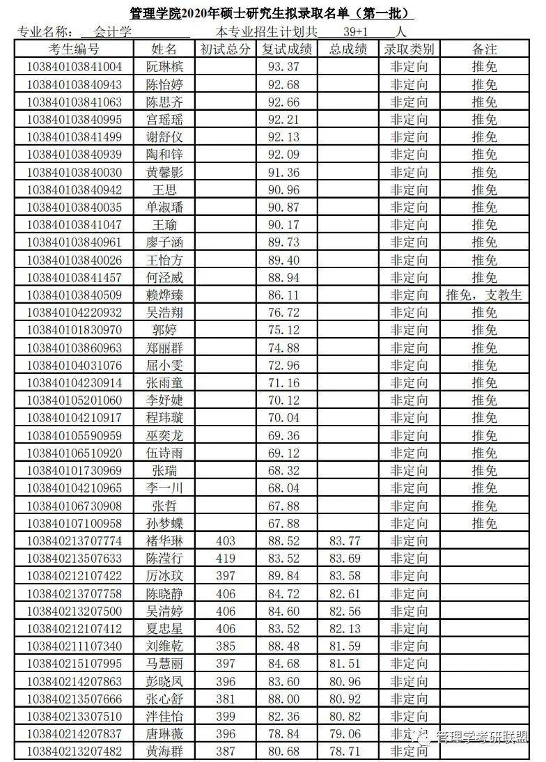会计学拟录取40人,其中推免27人,统考录取13人,最低分385,最高分419