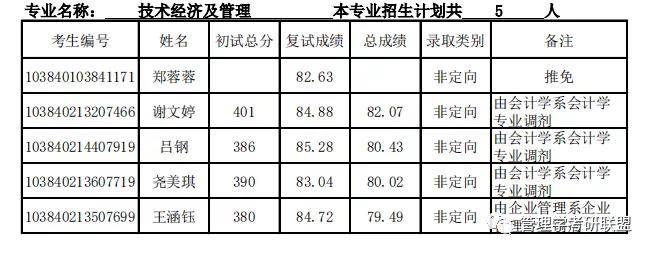 技术经济及管理拟录取5人,其中推免1人,会计学调剂录取3人,企业管理调剂录取1人