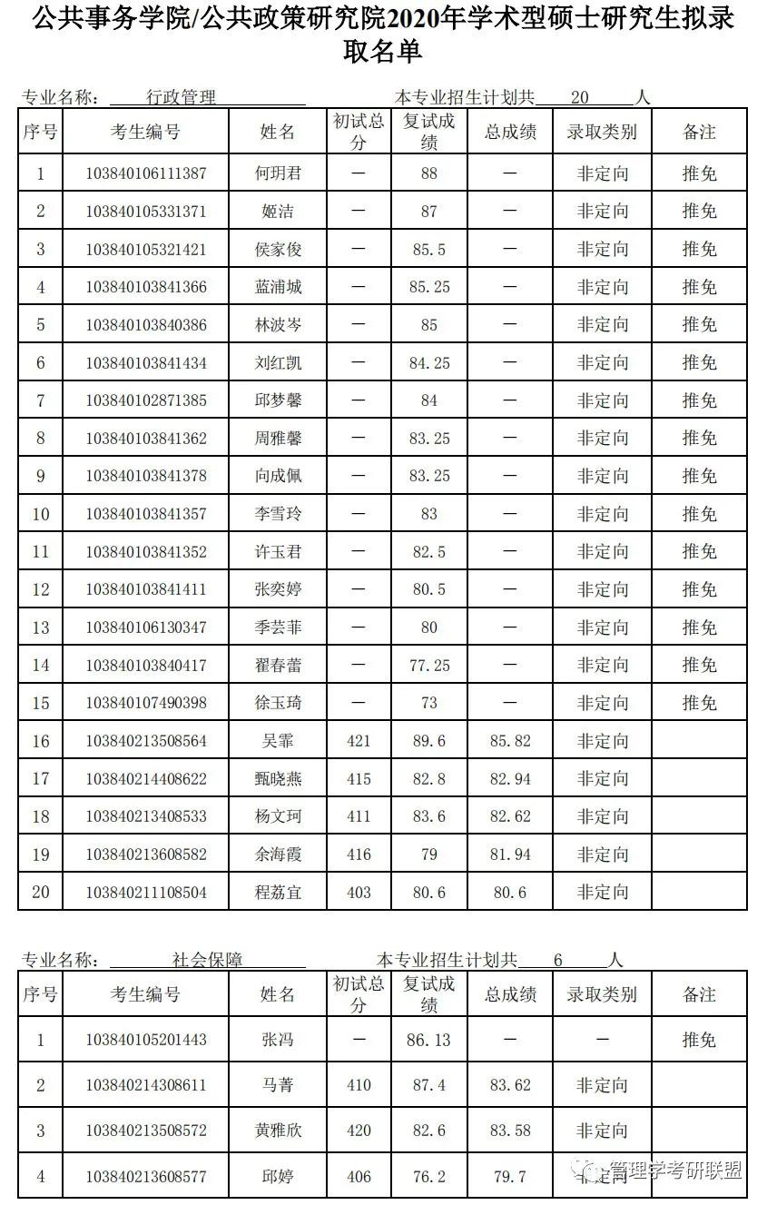 行政管理拟录取20人,其中推免15人,统考录取5人,最低分403,最高分421