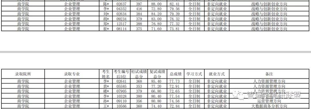 企业管理拟录取12人,最低分356,最高分416