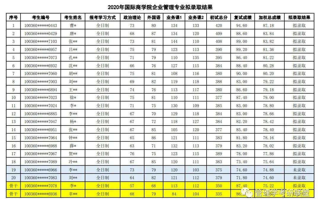 企业管理拟录取18人,另含骨干计划2人,最低分377,最高分420