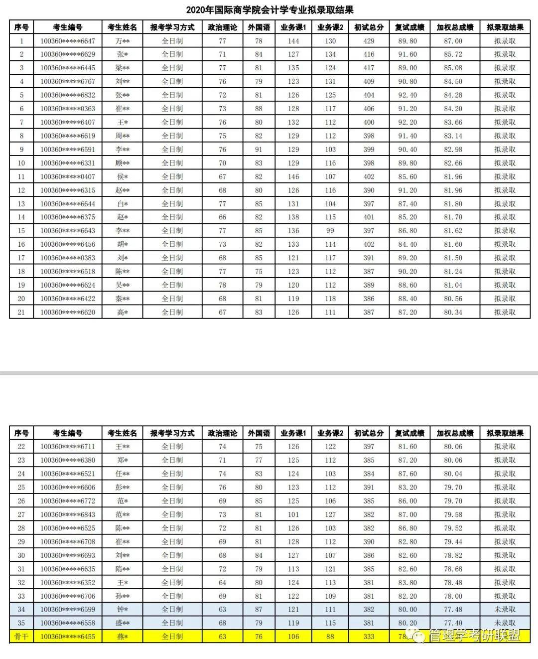 会计学拟录取33人,另含骨干计划1人,最低分381,最高分429
