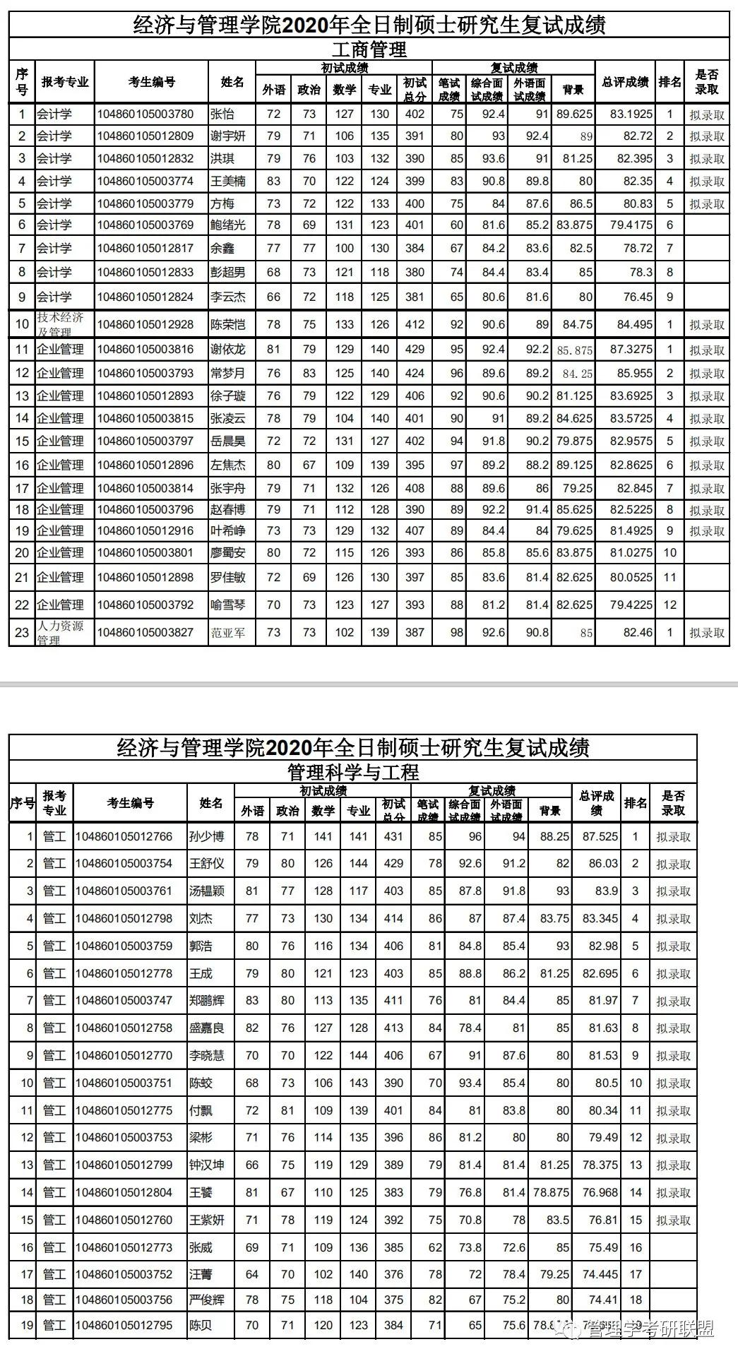 企业管理拟录取9人,淘汰3人,最低分390,最高分429