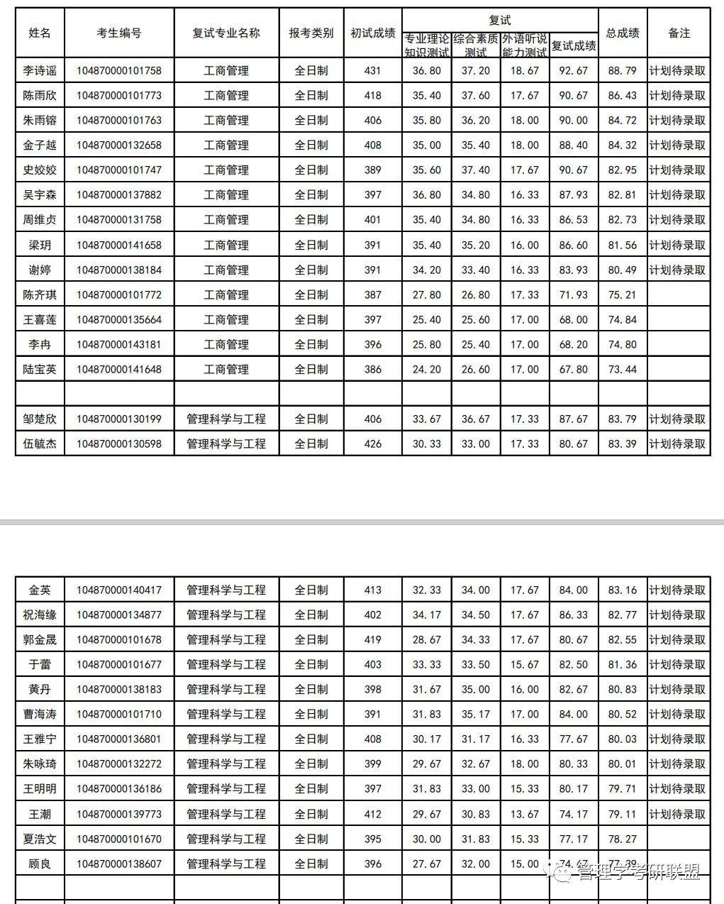 工商管理学硕拟录取9人,最低分391,最高分431