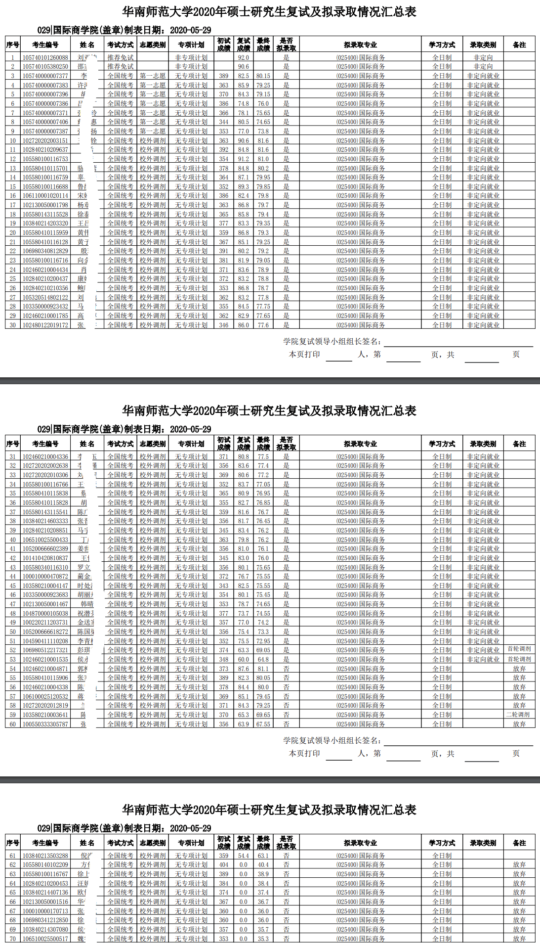 华南师范考研辅导班:2020年华南师范大学国际商学院硕士研究生复试成绩及拟录取名单