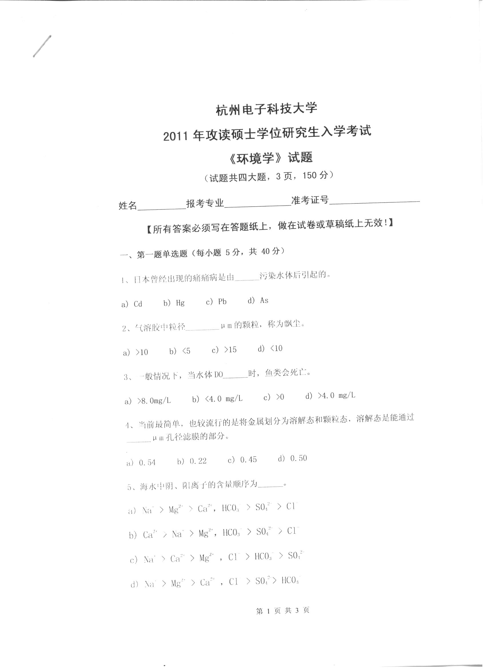 杭州电子科技大学考研辅导班:杭州电子科技大学2011年研究生入学考试环境学科目考试题目