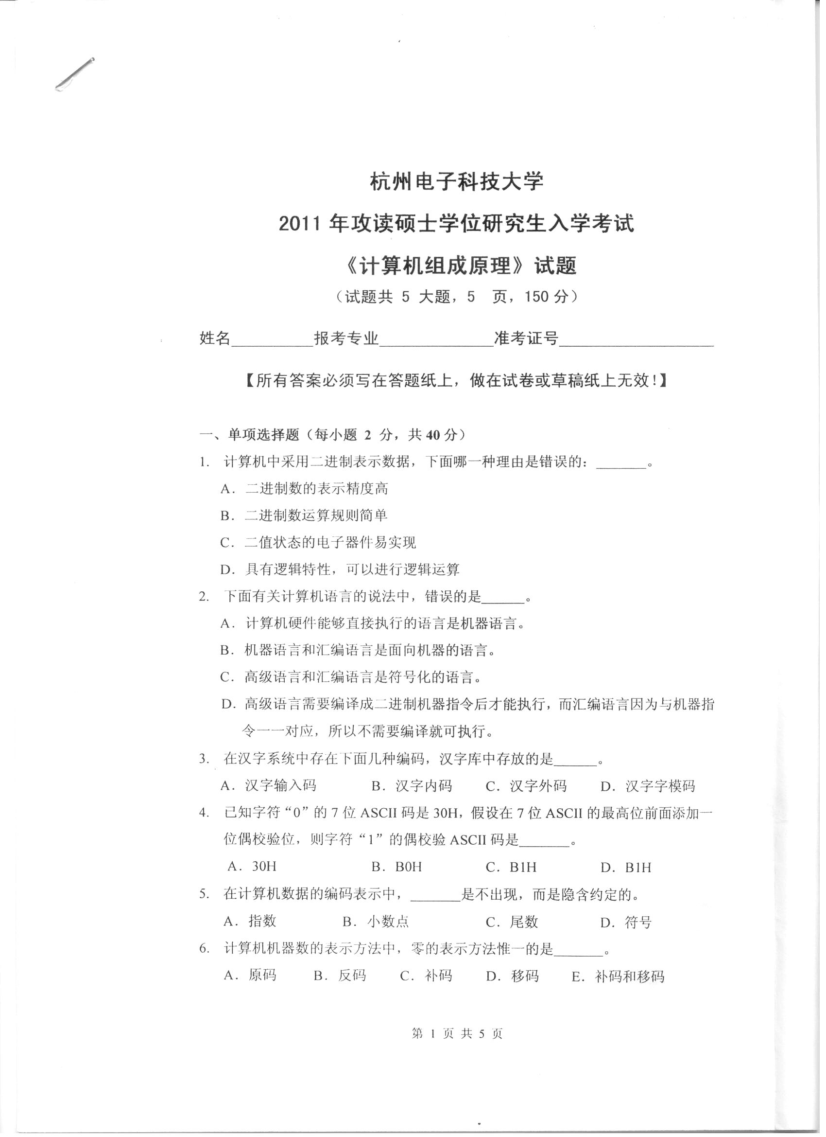 杭州电子科技大学考研辅导班:杭州电子科技大学2011年研究生入学考试计算机组成原理科目考试题目