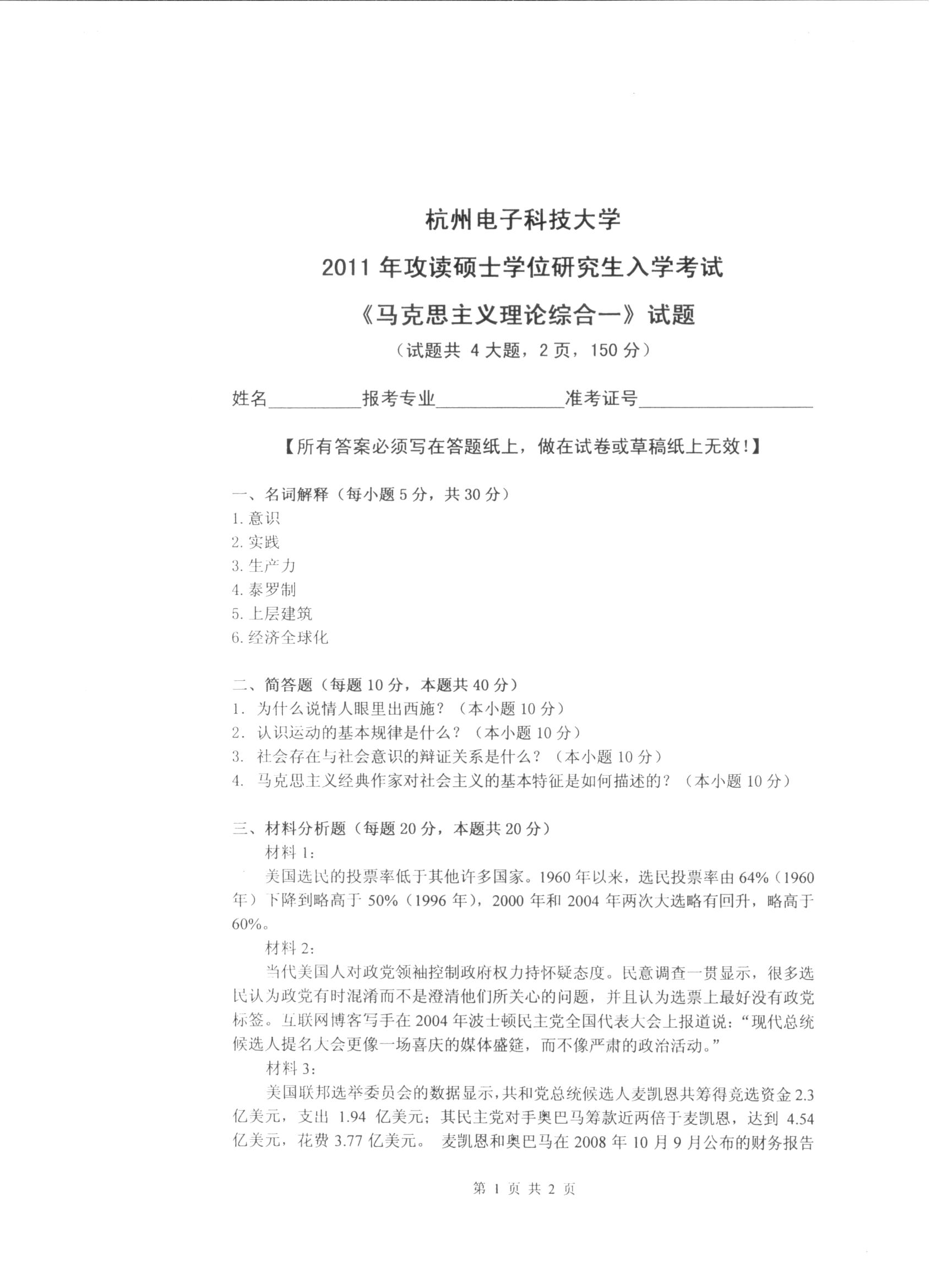 杭州电子科技大学考研辅导班:杭州电子科技大学2011年研究生入学考试马克思主义理论综合一科目考试