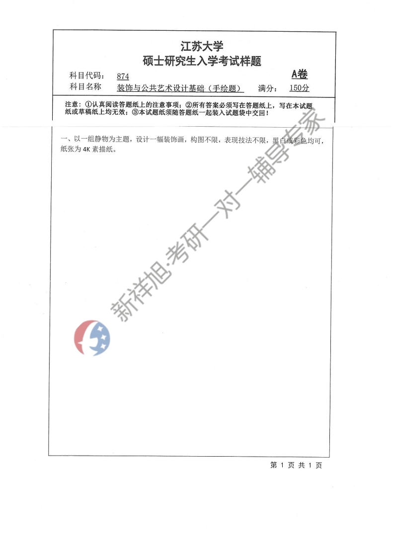 江苏大学考研辅导:江苏大学2019年874装饰与公共艺术设计基础(手绘题)初试考研真题