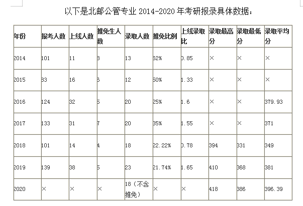 近几年,北京邮电大学公共管理专业一般每年报考100-135人左右,呈稳定上升趋势;录取人数稳定在14-18人左右(不含推免);录取比例大概1:8;录取平均360分以上(管理学国家线330-340分),呈上升趋势且增幅较大,竞争加剧,考研难度加大。