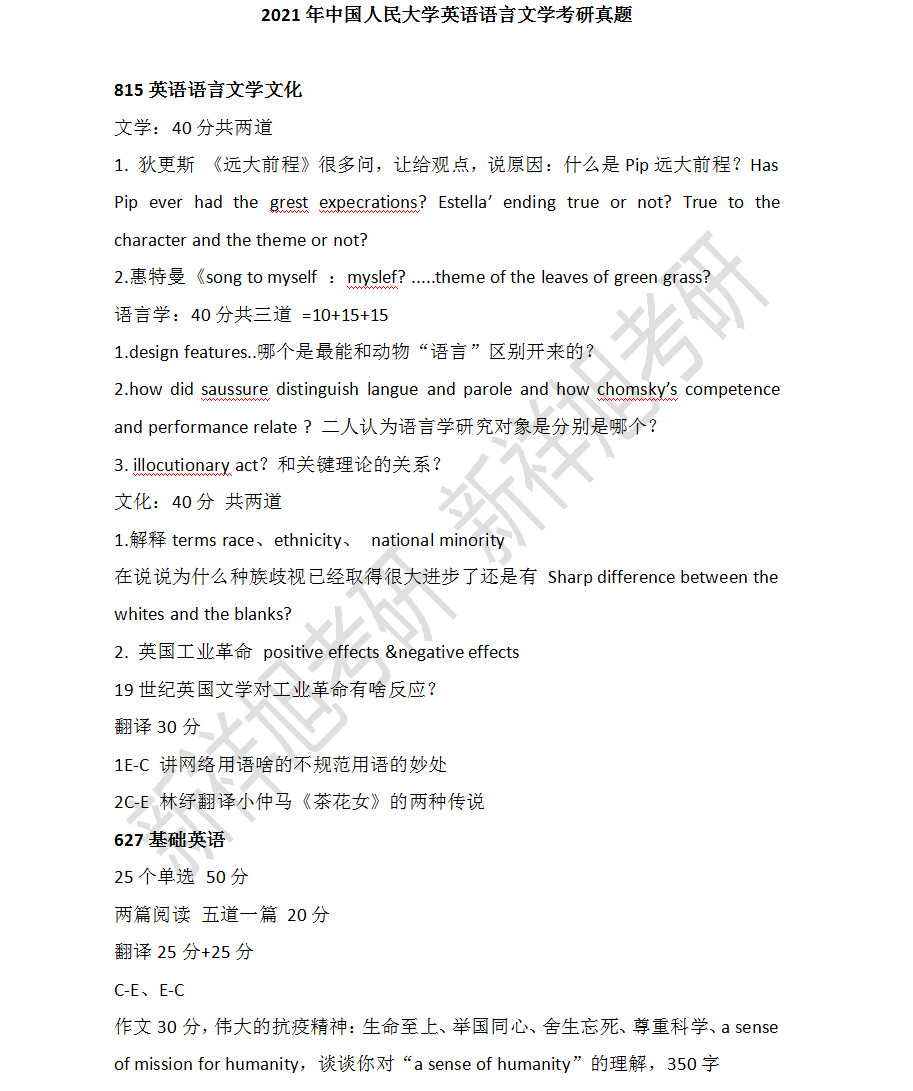 新祥旭考研:2021年中国人民大学英语语言文学考研真题