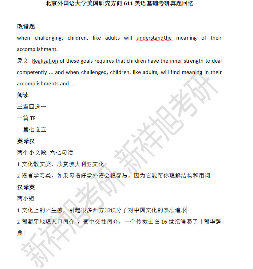 新祥旭考研:北京外国语大学美国研究方向611英语基础2021考研真题回忆