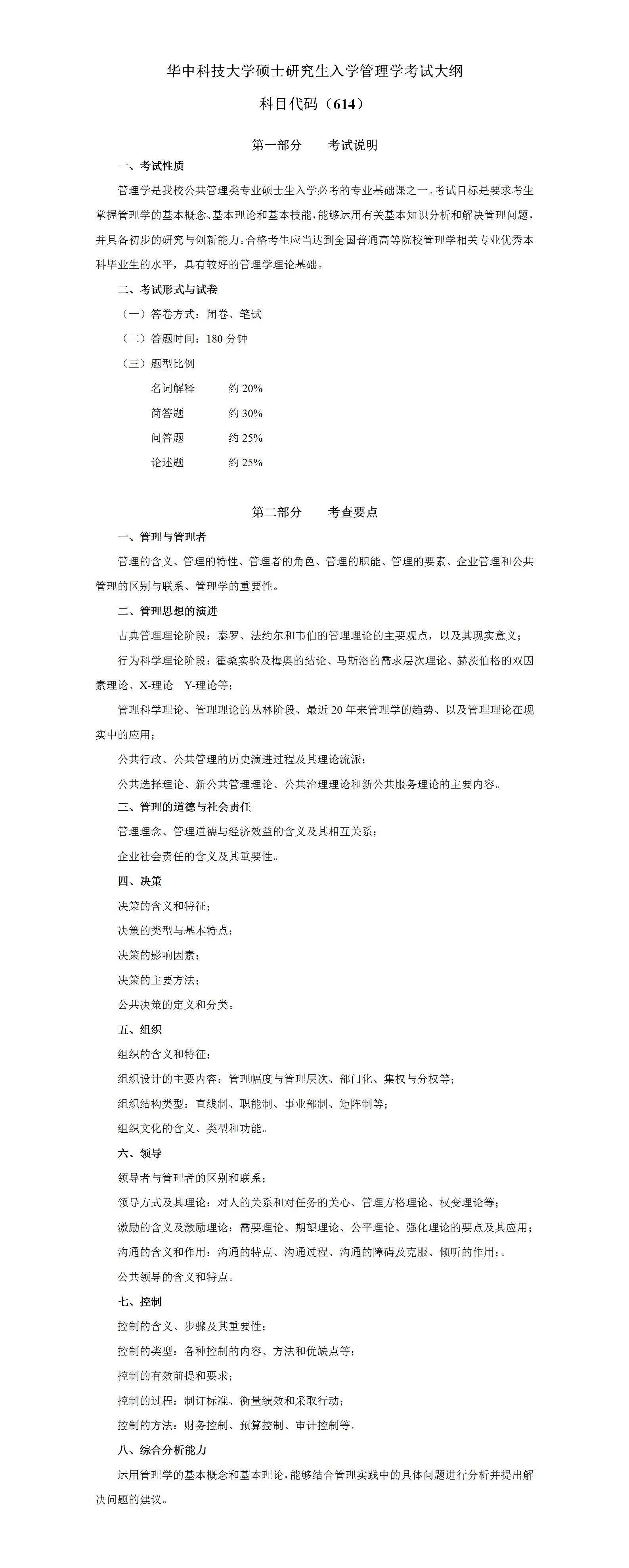华中科技大学21年考研大纲+题型分值+重难点:614管理学,如下图: